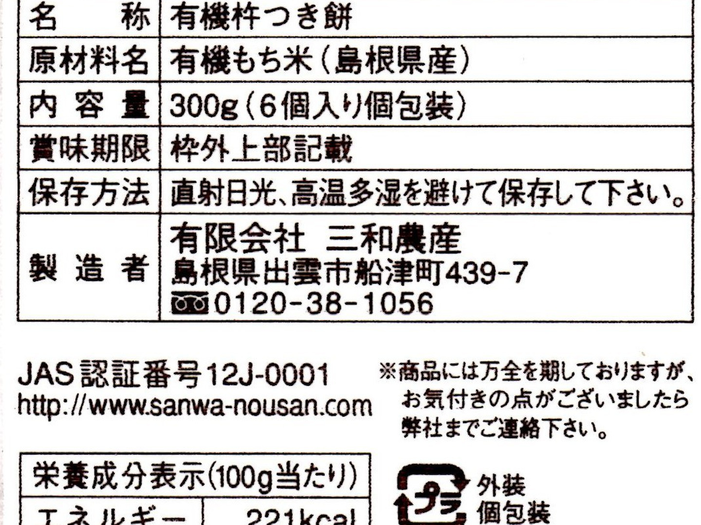 商品について あわせ買い対象 同生産者の別の「あわせ買い対象」商品と一緒にご注文いただくと、送料をまとめてお届けできる場合があります。 生産者からのお知らせ スマートレター(送料180円)で送付しますが、食べチョク様でのメール便送料は360円と固定での設定となっており、その分、商品価格を値下げしております。 もっと見る 内容 有機白米角餅600g(12個) 発送 日本郵便 送料 ¥ 常温便 + ¥ 0 数量1点ごとに送料が発生します。 種別 加工品 産地 島根県 特定原材料 なし 農薬節約栽培 加工品 有機JAS 家庭用 動物性堆肥不使用 ビニール包装 島根県x加工品 商品説明 パッケージのラベル無し商品です。パッケージ無しの訳ありですが通常商品と変わらず美味しくお召し上がりいただけます。有機認証取得、白米餅のご案内です。出雲大社で有名な島根県出雲市で原料米の生産から、お餅加工まで有機JAS認証を取得して自社で一貫製造しています。白米餅は杵つき餅のきめ細かく滑らかな食感をお楽しみいただける逸品です。真珠や絹のような美しい光沢があり、するするとよく伸びて、また、味付けしなくてもお米本来が持つ甘味を存分にお楽しみいただけます。簡易包装ですが一つ一つ個包装になっていますので一日に一個ずつ、二日に一個などお手軽にお召し上がりいただけます。保存料添加物は使用していませんので、賞味期限まで2カ月程度となっているためご注意下さい。■内容量600g(12個)■原材料名島根県産有機精米■保存方法お届け後冷蔵庫にて保存してください。なるべく早めにお召し上がりください。■おもな原産地島根県出雲市■賞味期限2カ月 もっと見る この商品のことをお友達にもシェアしませんか ポスト シェア