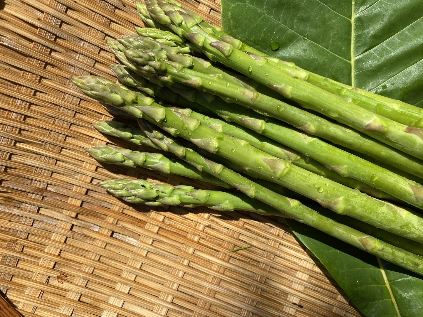 自家製堆肥で育てた甘くてジューシーなアスパラガスです。茹でたり素揚げにしたり、食べ方いろいろで楽しんでいただけます。