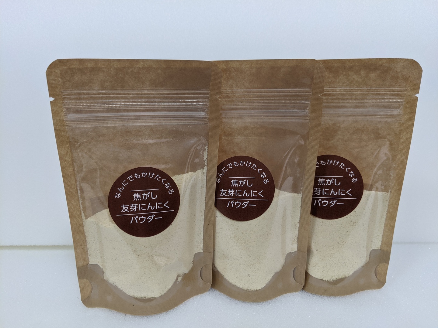 福岡県産友芽にんにくを乾燥させてパウダー状に加工して香ばしく炒っています。そのままお使いいただけます。賞味期限は製造日より半年間。高温多湿を避けて保存してください。チャーハンや野菜炒め、カレーにピッタリです!内容量は、50グラムです。