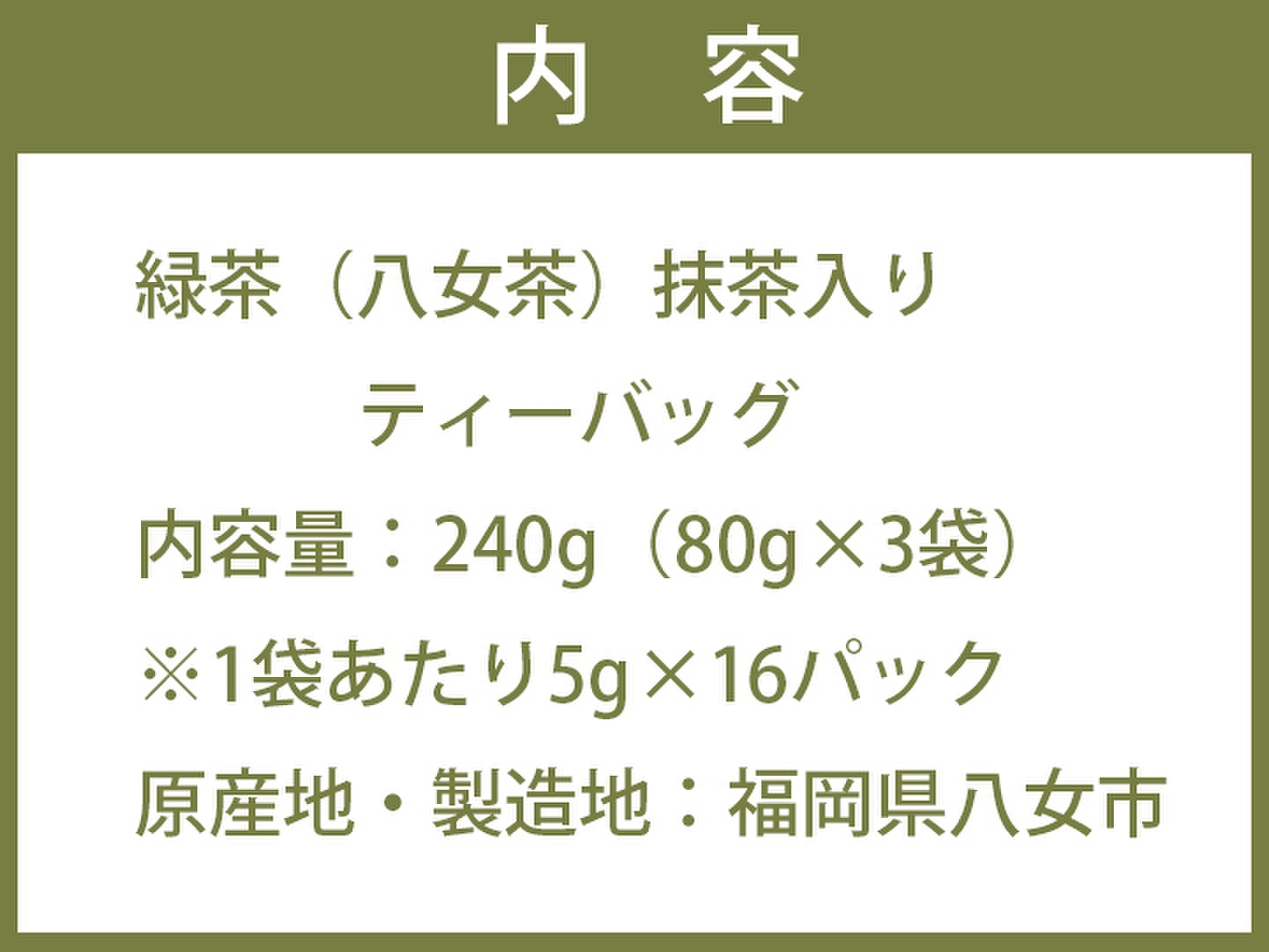簡単美味しい!八女茶水出し緑茶(抹茶入り)ティーバッグ(240g [80g×3袋])