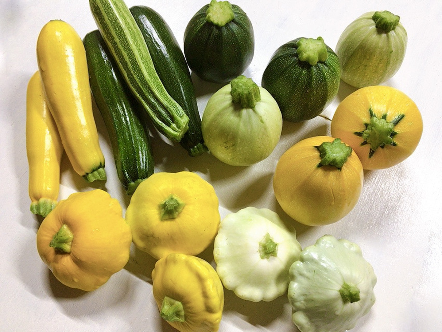 無農薬無化学肥料、露地栽培した「丸ズッキーニ」「ロングズッキーニ」「UFOズッキーニ」の3種のズッキーニのミックスでお届けします。