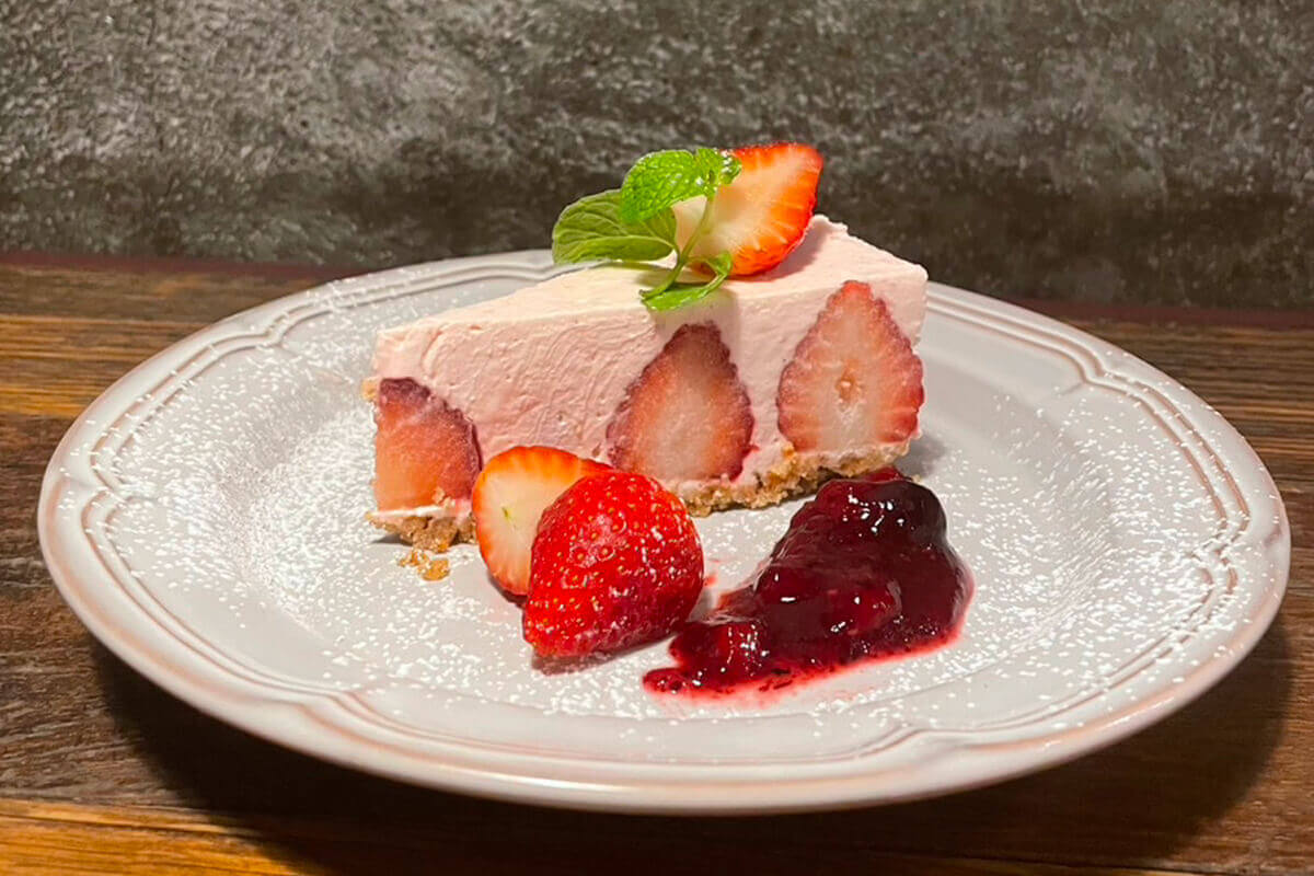 埼玉県産ブランドいちご「あまりん」を使用した、いちごのレアチーズケーキ。濃厚でなめらかなレアチーズに、あまりんのしっかりとした甘みと香りを合わせました。いちごのフレッシュさと程よい酸味が、後味を軽やかにまとめてくれる一皿です。