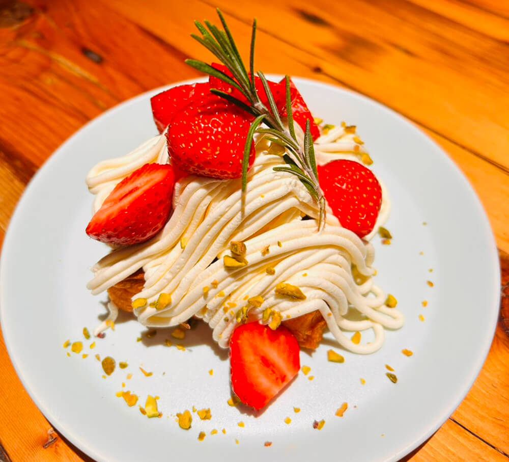 生クリームと牛乳の美味しさをそのまま閉じ込めた真っ白でなめらかなパンナコッタに、埼玉県オリジナルいちご品種「あまりん」を合わせた贅沢なデザート。濃厚でまったりとしたコクがありながら、口に運ぶとやさしくほどけるような、ぷるんとした食感をお楽しみいただけます。トップには、瑞々しい「あまりん」を角切りにしてあしらい、さらに果実そのものの美味しさを堪能していただけるよう、丸ごと一粒を添えて仕上げました。芳醇な甘みと華やかな香りが、ミルキーなパンナコッタと重なり合う、シンプルながらも満足感の高い一皿です。