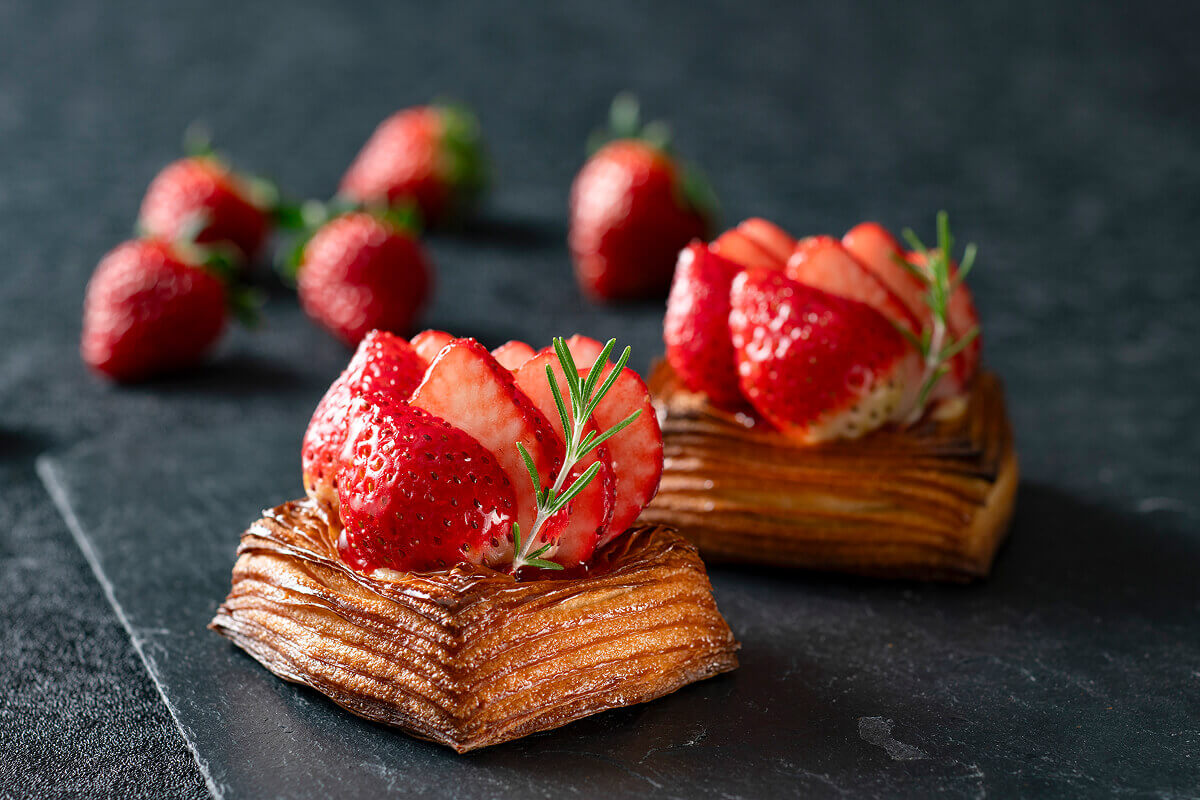 ワッフルのふわふわ食感と.パイのサクサク感が楽しめるミルフィーユ風ワッフル。埼玉産苺を贅沢に使用した、自家製苺のコンフィチュールとフレッシュ苺の甘さと酸味が広がり旬の苺を堪能できる限定スイーツ。