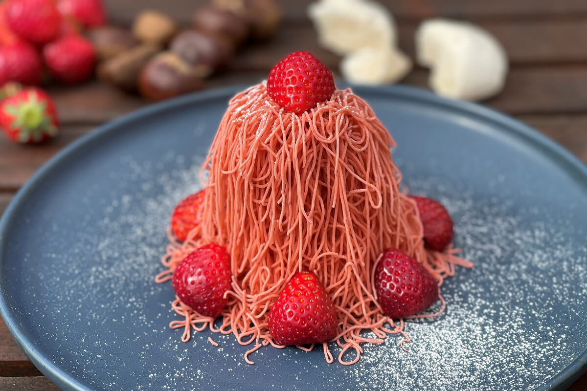 苺のマロンクリームであまりん苺と北海道純生クリームをたっぷりと中に閉じ込めた 濃厚な味わいの中にさわやかな風味が駆け抜ける今だけの特別なモンブラン。