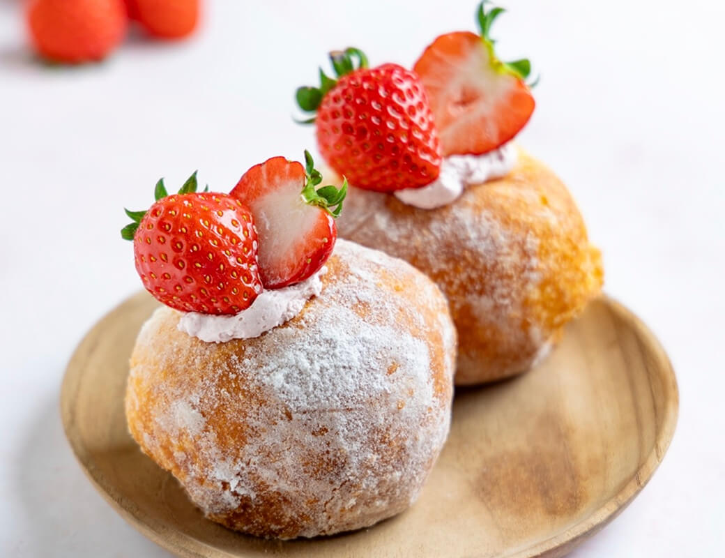 自家製のあまりん苺のクリームがたっぷり入ったこだわりのふわっふわ生地の生ドーナツです。