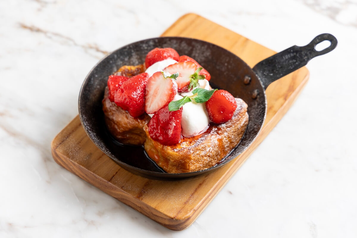 旬を迎える埼玉県産いちごを贅沢に使用した華やかなビジュアルのホワイトモンブランフレンチトーストが登場。搾りたてのホワイトチョコレートガナッシュのクリームの下には焼きたてのフレンチトーストとバニラアイス。苺の爽やかな酸味とホワイトチョコの優しい甘さのハーモニーを味わえます。