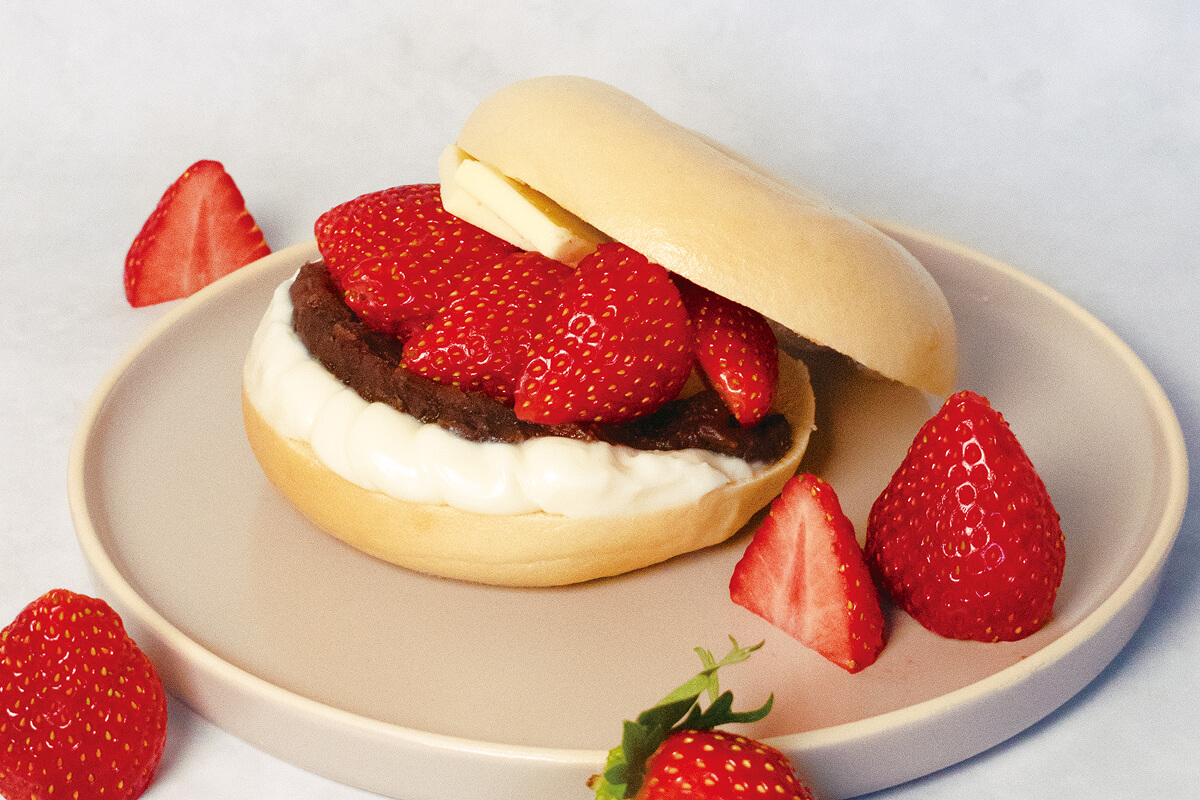 あんことまろやかな豆乳クリームの組み合わせに、甘さと酸味がほどよい「あまりん」苺を組み合わせたベーグルスイーツサンドイッチです。