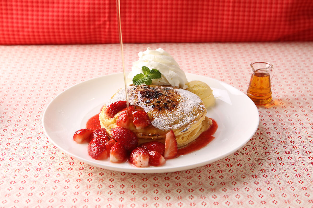大人気のパンケーキブリュレにフレッシュないちご「あまりん」がたっぷり!糖度の高さと程よい酸味が特徴の「あまりん」と、香ばしくキャラメリゼされたやさしい甘さのカスタードクリームの相性が抜群です。