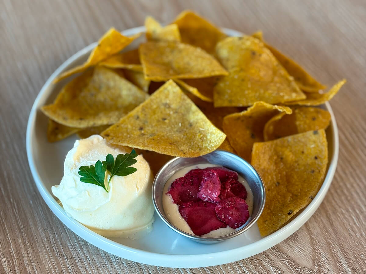 普段は単品メニューとして販売していないグルテンフリートルティーヤチップスをあまりんとクリームチーズのディップでお楽しみいただけるようご用意しました。キタデタコスならではの「あまじょっぱい一品」を、この機会にぜひお楽しみください。