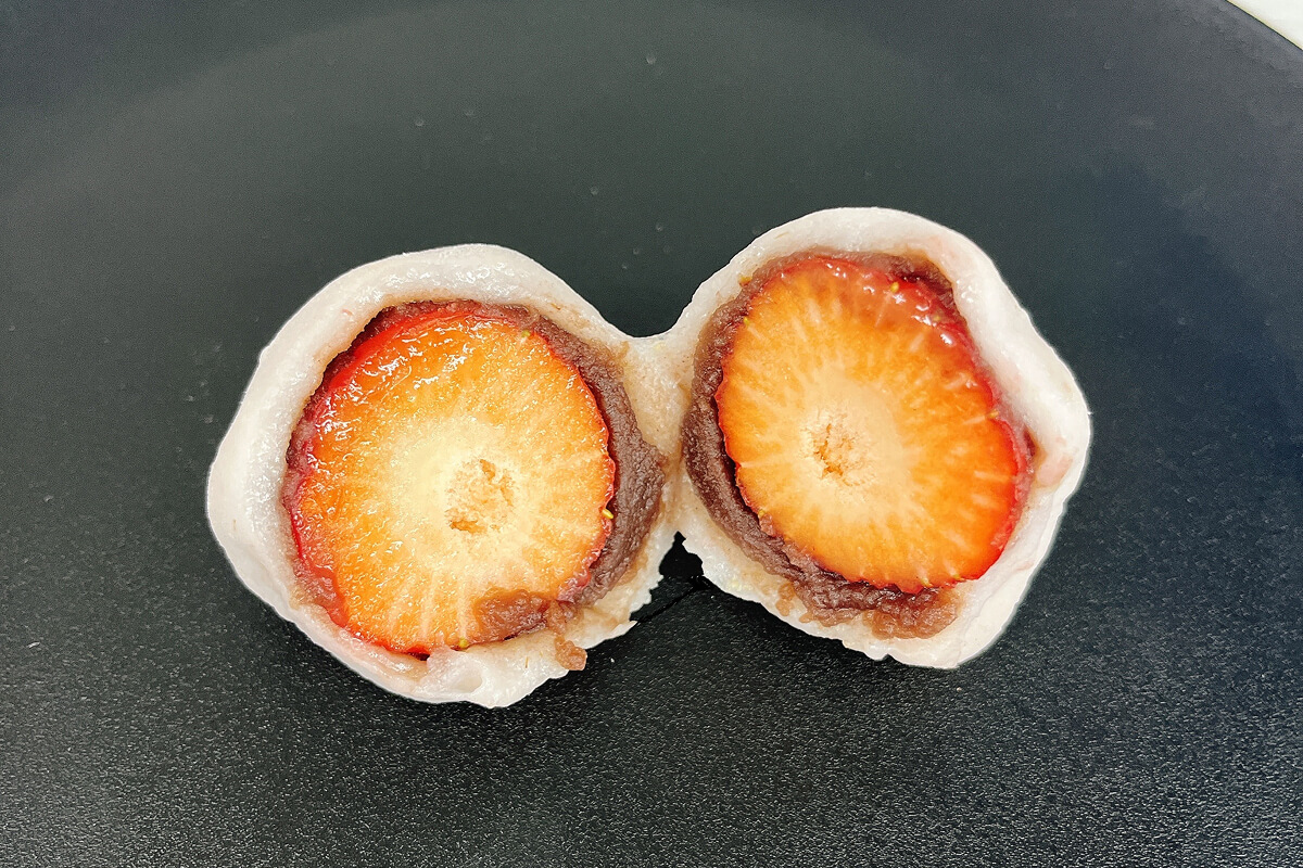 柔らかな果肉が特徴の埼玉県産「章姫(あきひめ)」を使用した、大きな苺大福。みずみずしいいちごとさらりとした餡のバランスの良さが後を引きます。