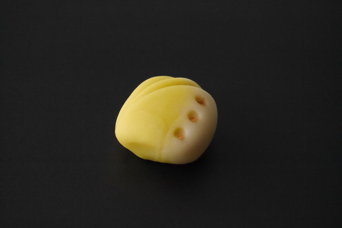 白あんに埼玉のいちご「あまりん」ペーストを加えたいちごあんをクチナシ色素で染めた練切で包み、春の野に飛び回る蝶に見立てました。