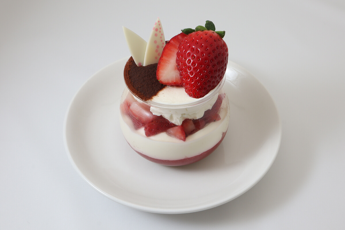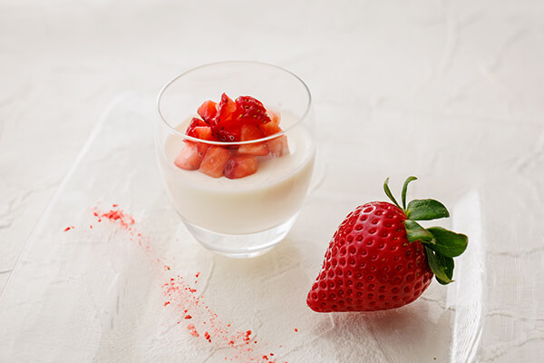 生クリームと牛乳の美味しさをそのまま閉じ込めた真っ白でなめらかなパンナコッタに、埼玉県オリジナルいちご品種「あまりん」を合わせた贅沢なデザート。濃厚でまったりとしたコクがありながら、口に運ぶとやさしくほどけるような、ぷるんとした食感をお楽しみいただけます。トップには、瑞々しい「あまりん」を角切りにしてあしらい、さらに果実そのものの美味しさを堪能していただけるよう、丸ごと一粒を添えて仕上げました。芳醇な甘みと華やかな香りが、ミルキーなパンナコッタと重なり合う、シンプルながらも満足感の高い一皿です。